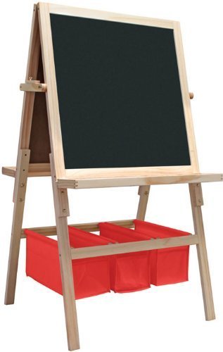 This new Art Activity Easel is constructed of fine quality sustainably harvested pine wood to last for years to come. It features large trays on both sides and generously sized white board and chalkboard surfaces as well as a hidden paper roll that feeds over either side. Replacement rolls sold separately. It can be converted to a table top easel with attached rubber feet for surface protection. The adjustable legs accommodate multiple users of different height or adjusts as the artist grows. Sturdy washable bright red baskets provide convenient and ample built-in storage space. Light assembly